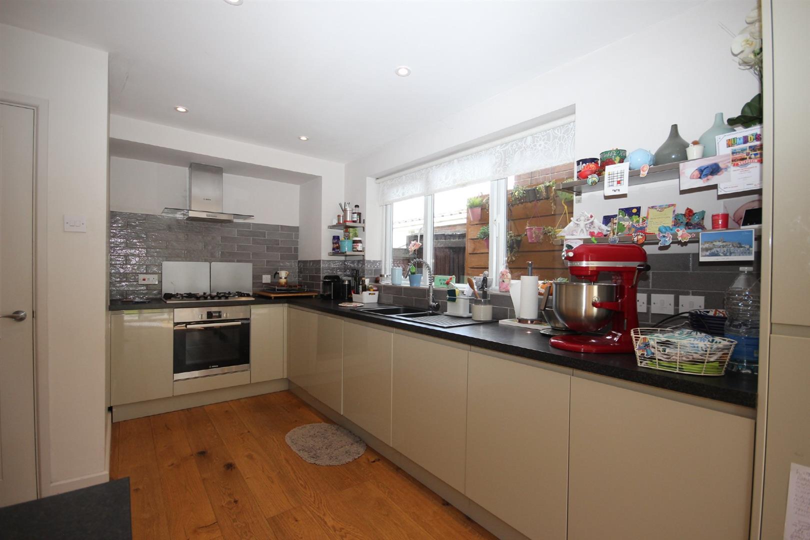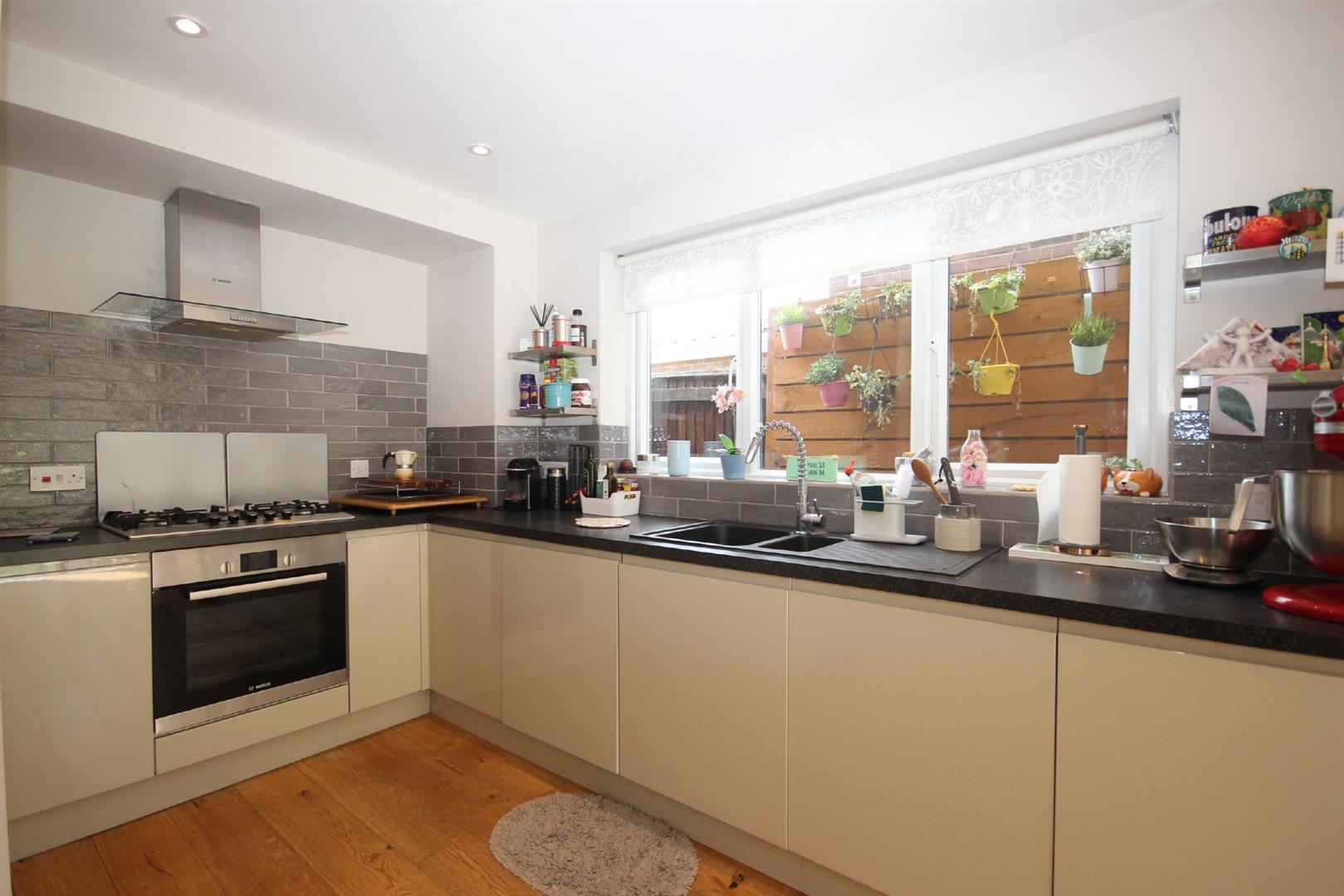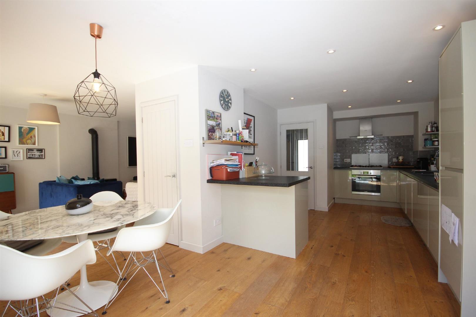 (L Shaped) Open plan living, built in five ring gas hob with oven under and extractor fan over, integrated washer/dryer, dish washer and fridge freezer, base mounted units, wood flooring, inset spot lighting, under stairs cupboard, further built in cupboard, double glazed by- folding doors to rear.