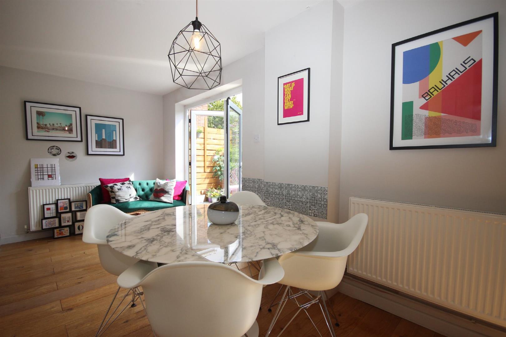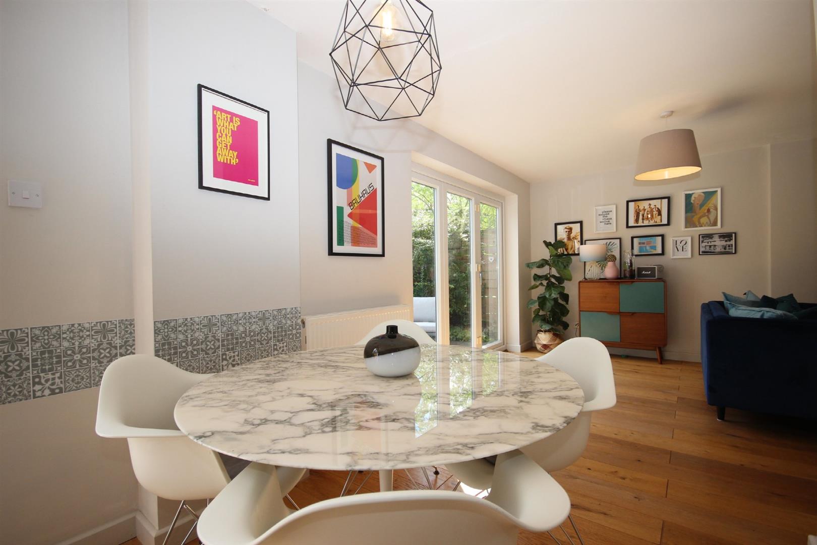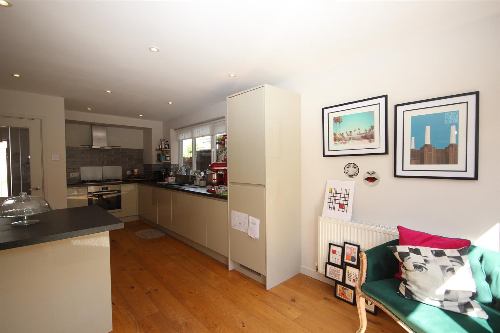 (L Shaped) Open plan living, built in five ring gas hob with oven under and extractor fan over, integrated washer/dryer, dish washer and fridge freezer, base mounted units, wood flooring, inset spot lighting, under stairs cupboard, further built in cupboard, double glazed by- folding doors to rear.