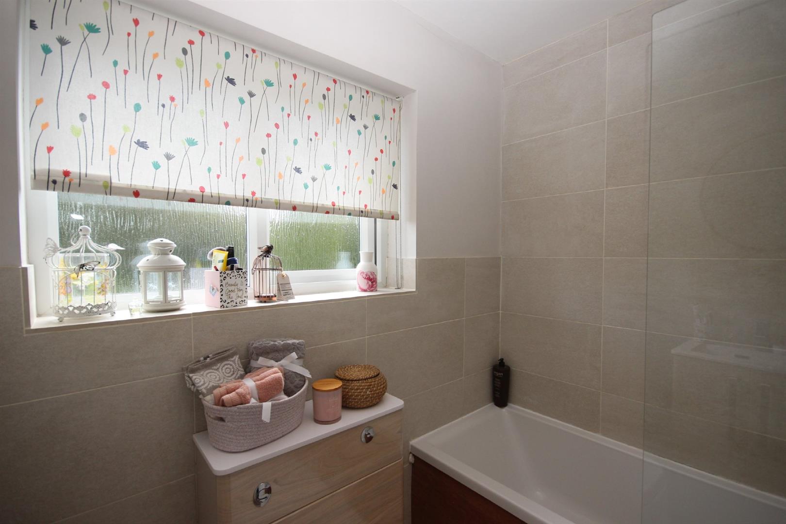 Three piece suite comprising bath with mixer shower over, low level wc, vanity wash hand basin, tiled flooring, heated towel rail, double glazed window to rear.