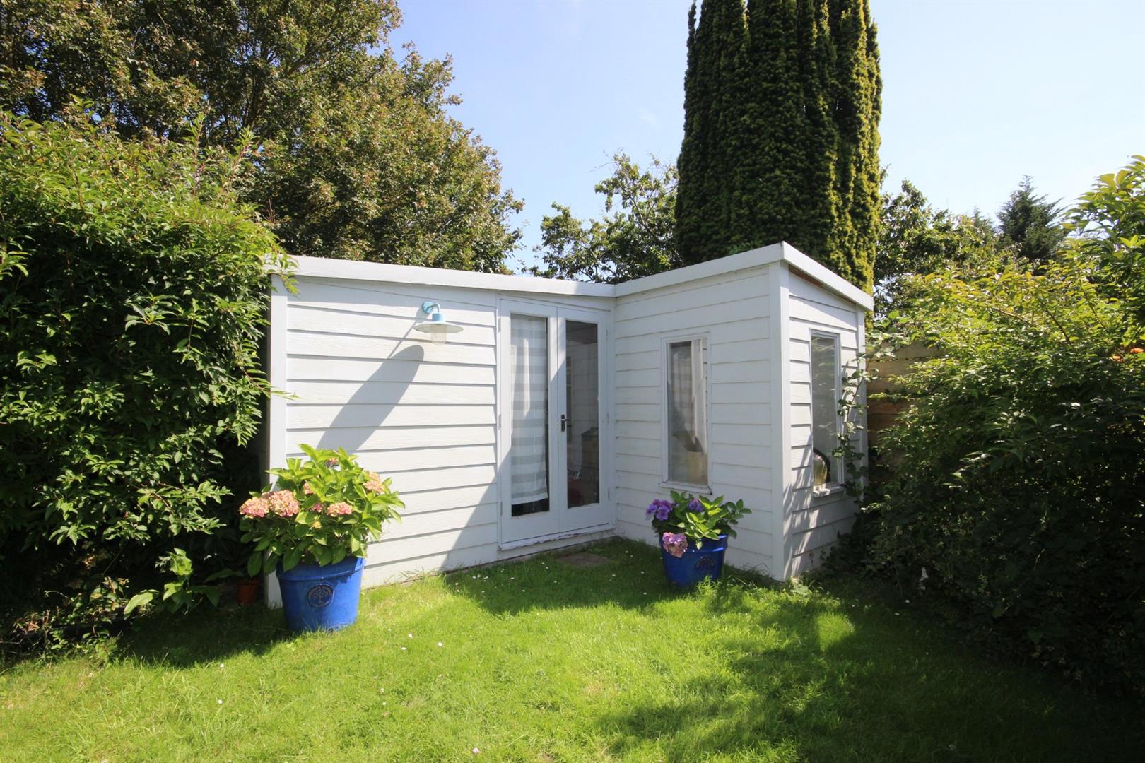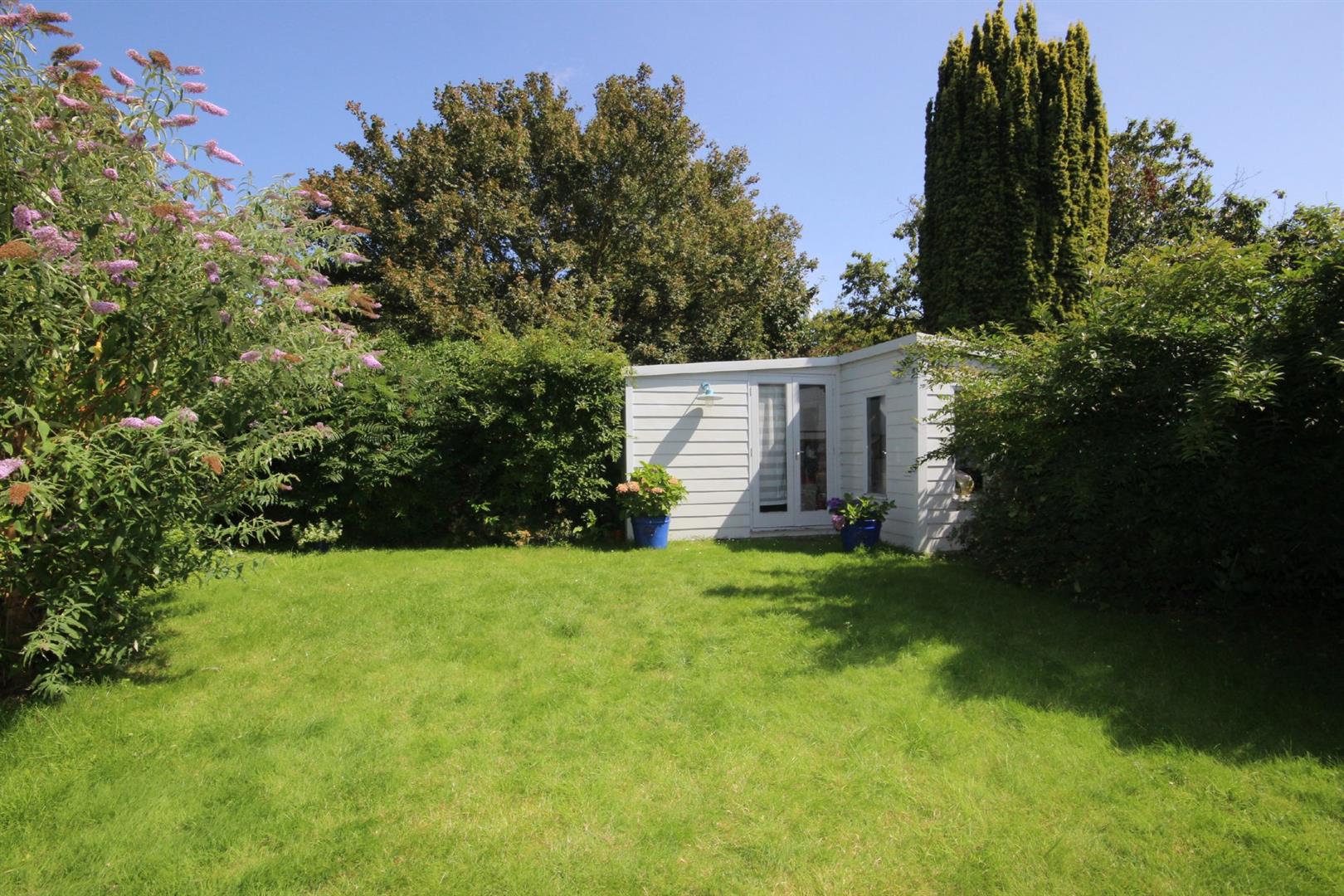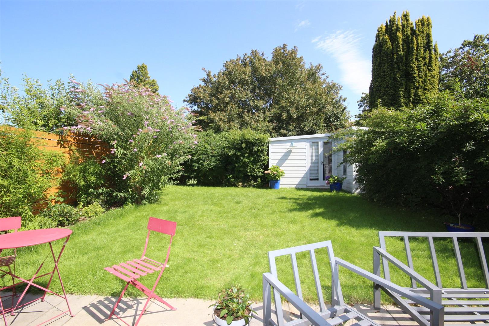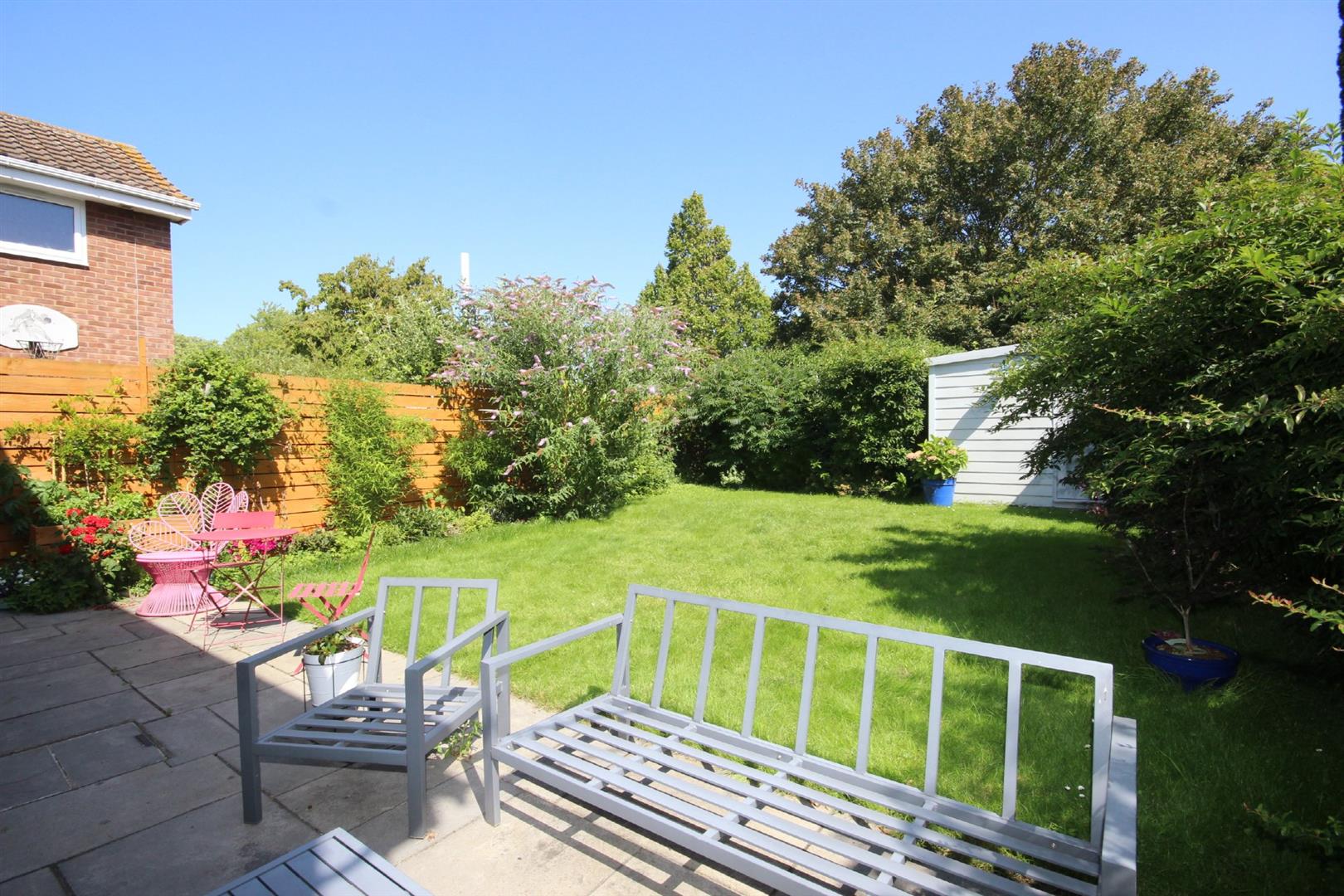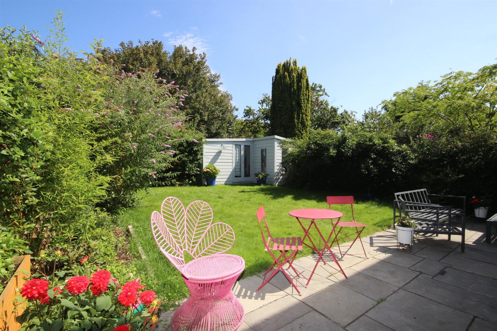 Patio area, flower and shrub borders, wood panel fence surround, laid to lawn, two gated side access, water tap to side, outside light. Garden shed/office.