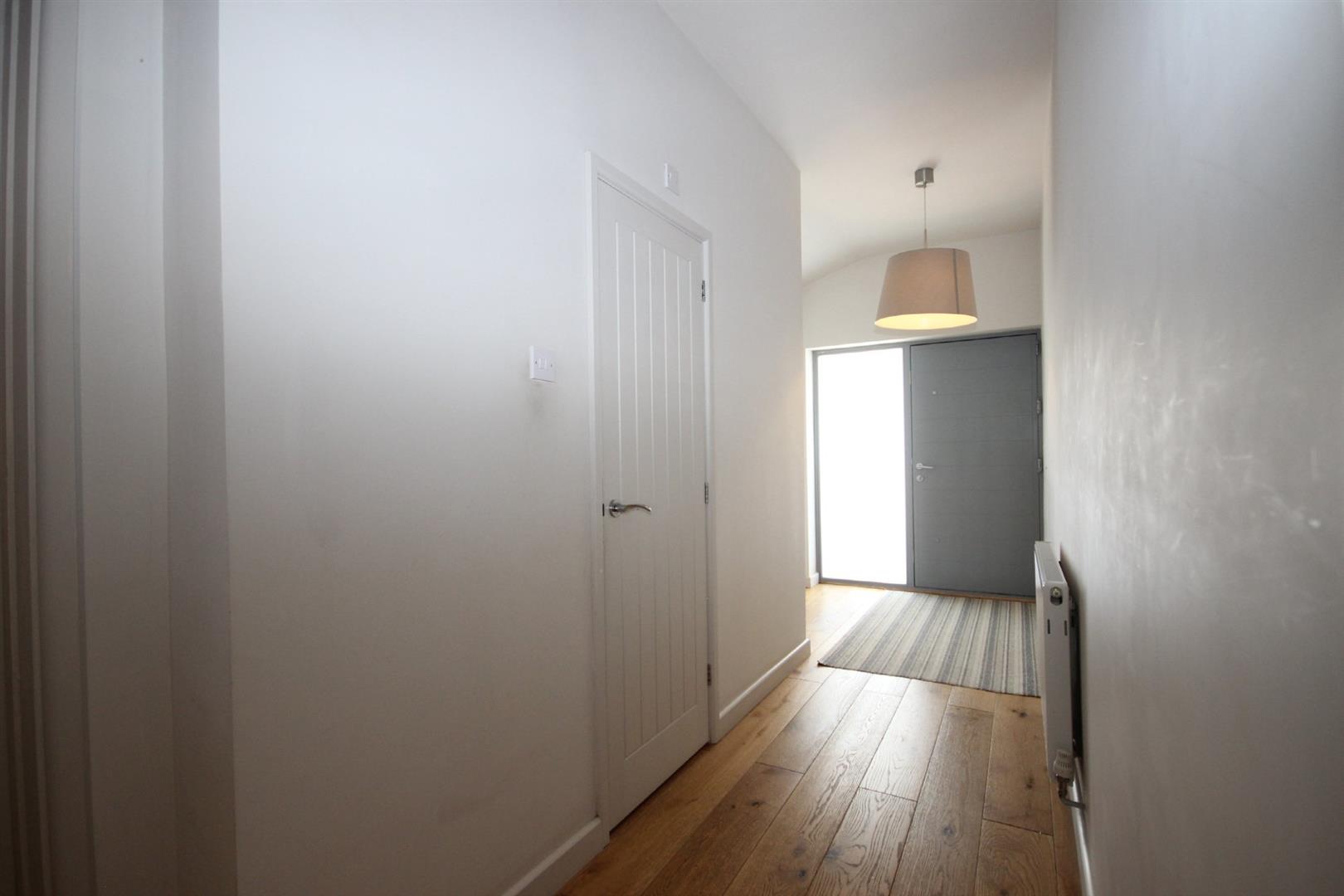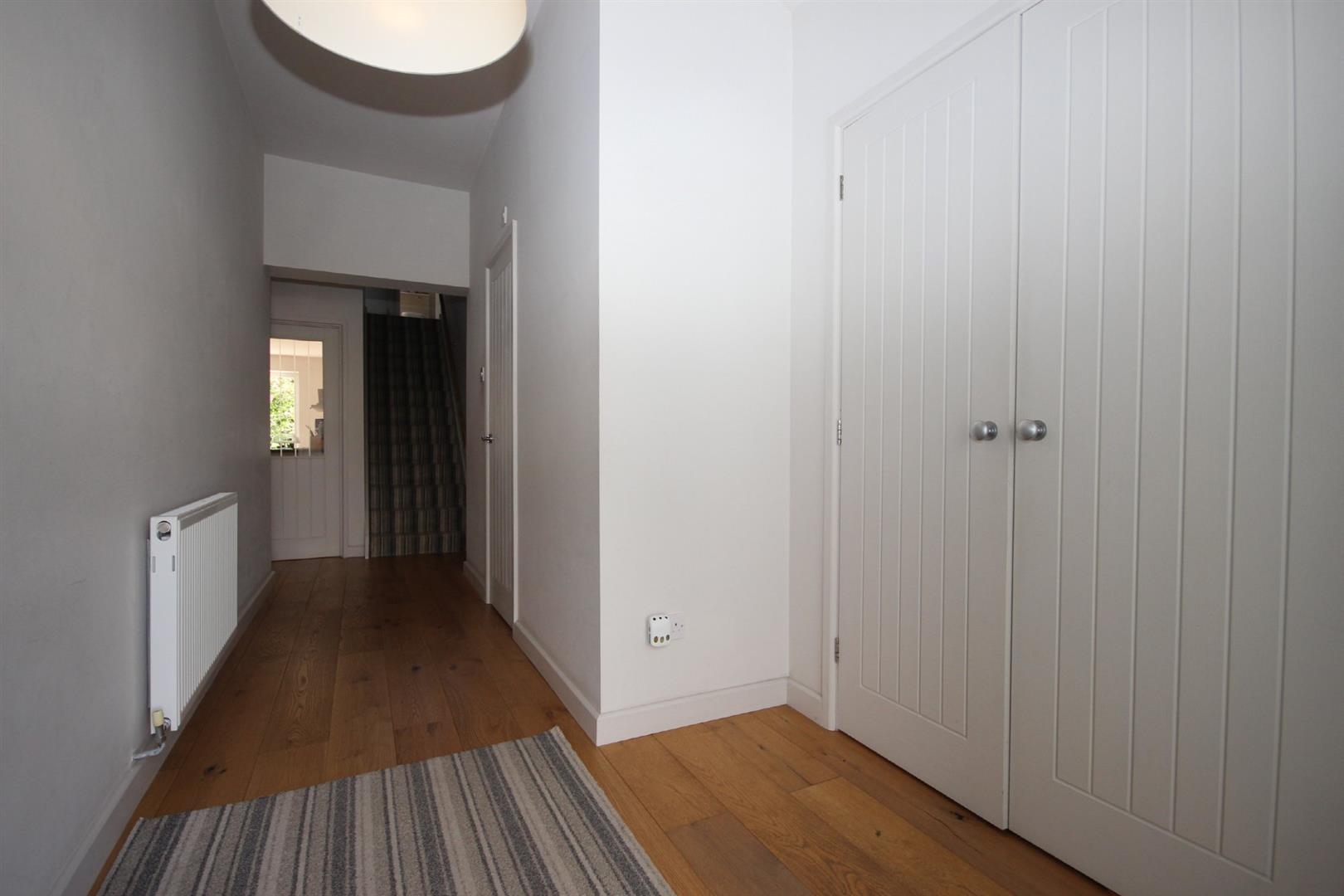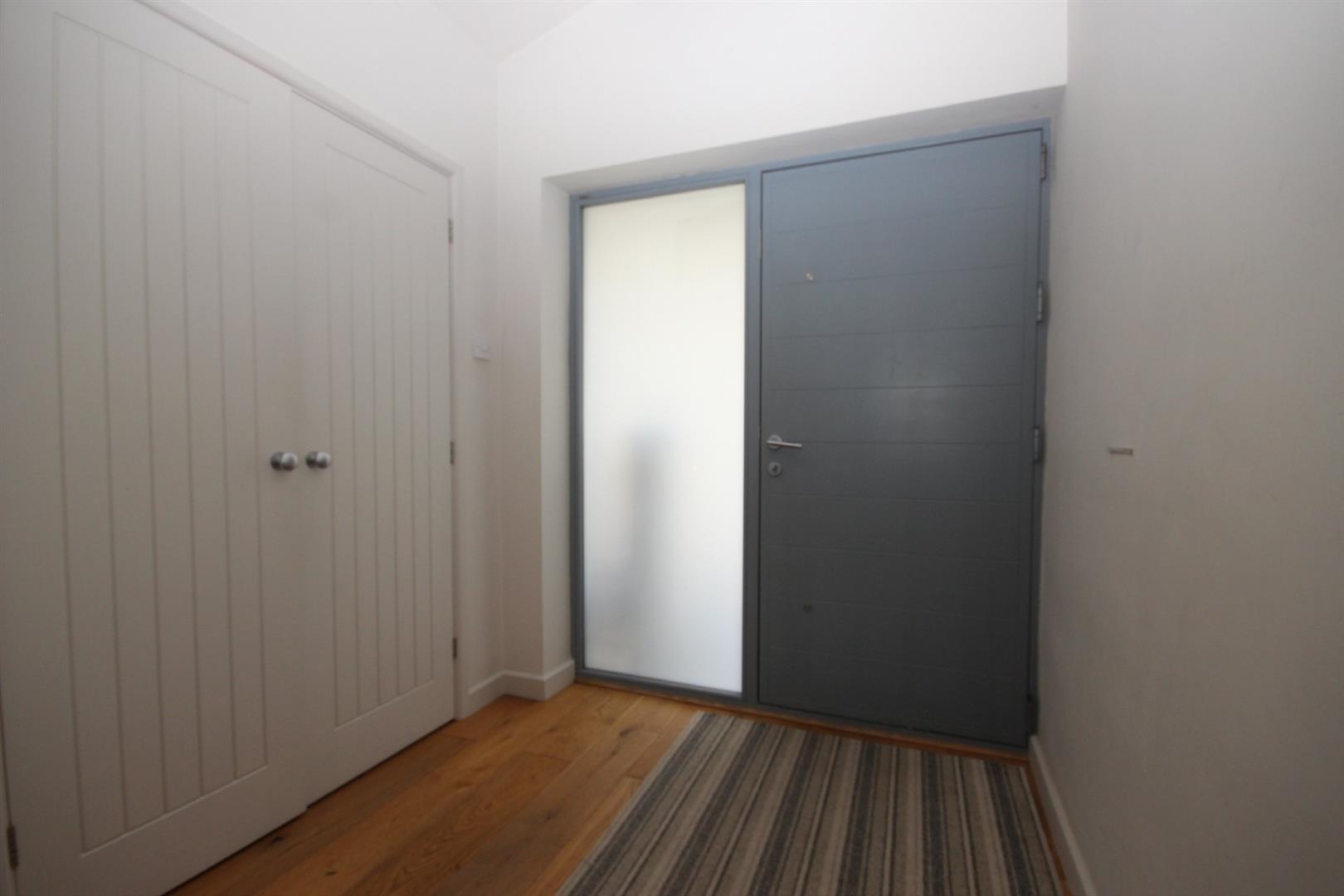 (Narrowing to 4ft) Opaque double glazing picture window and door to front, wood flooring, built in storage cupboard, stairs to first floor, doors to main rooms.