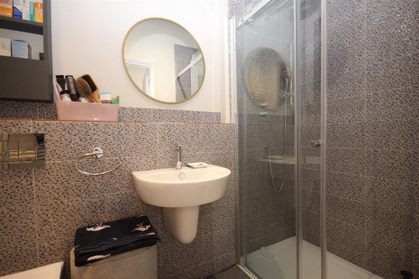 Three piece suite comprising shower, wash hand basin, low level wc, heated towel rail, inset spot lighting, tiled flooring.