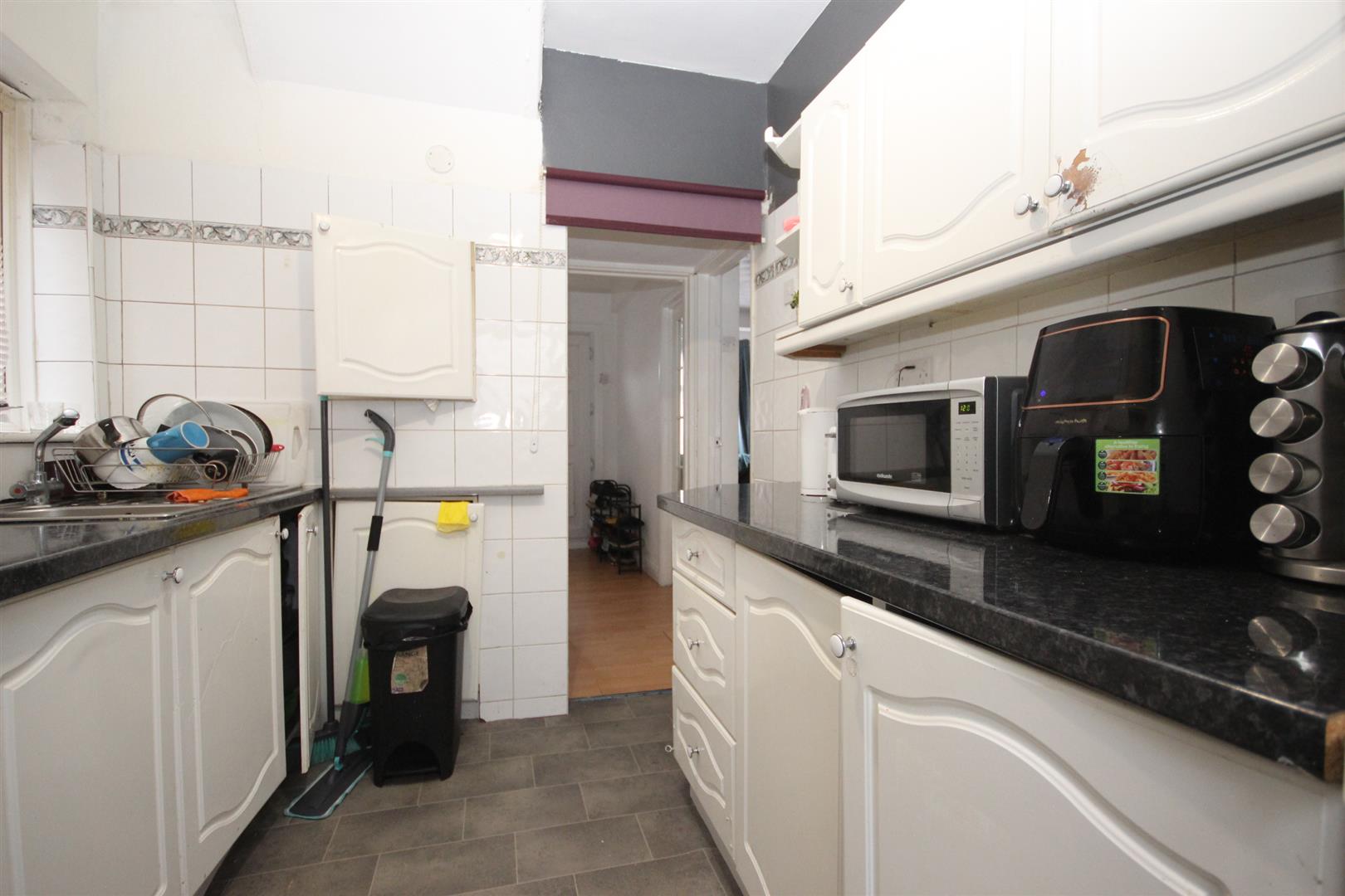 Built in four ring gas hob with oven under and extractor over, base and wall mounted units, plumbing for washing machine, double glazed window to side and double glazed door to rear.