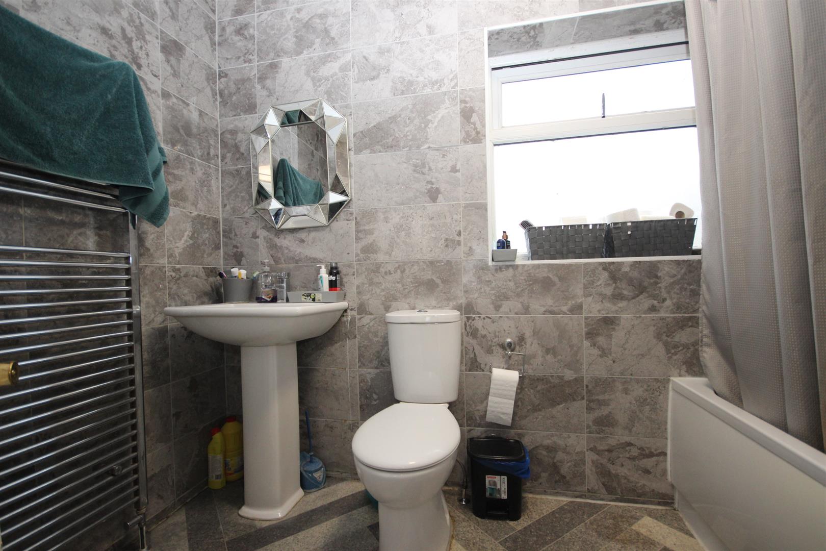 Three piece suite comprising paneled bath with mixer shower over, low level WC, pedestal wash hand basin, double glazed window to rear, heated towel rail.