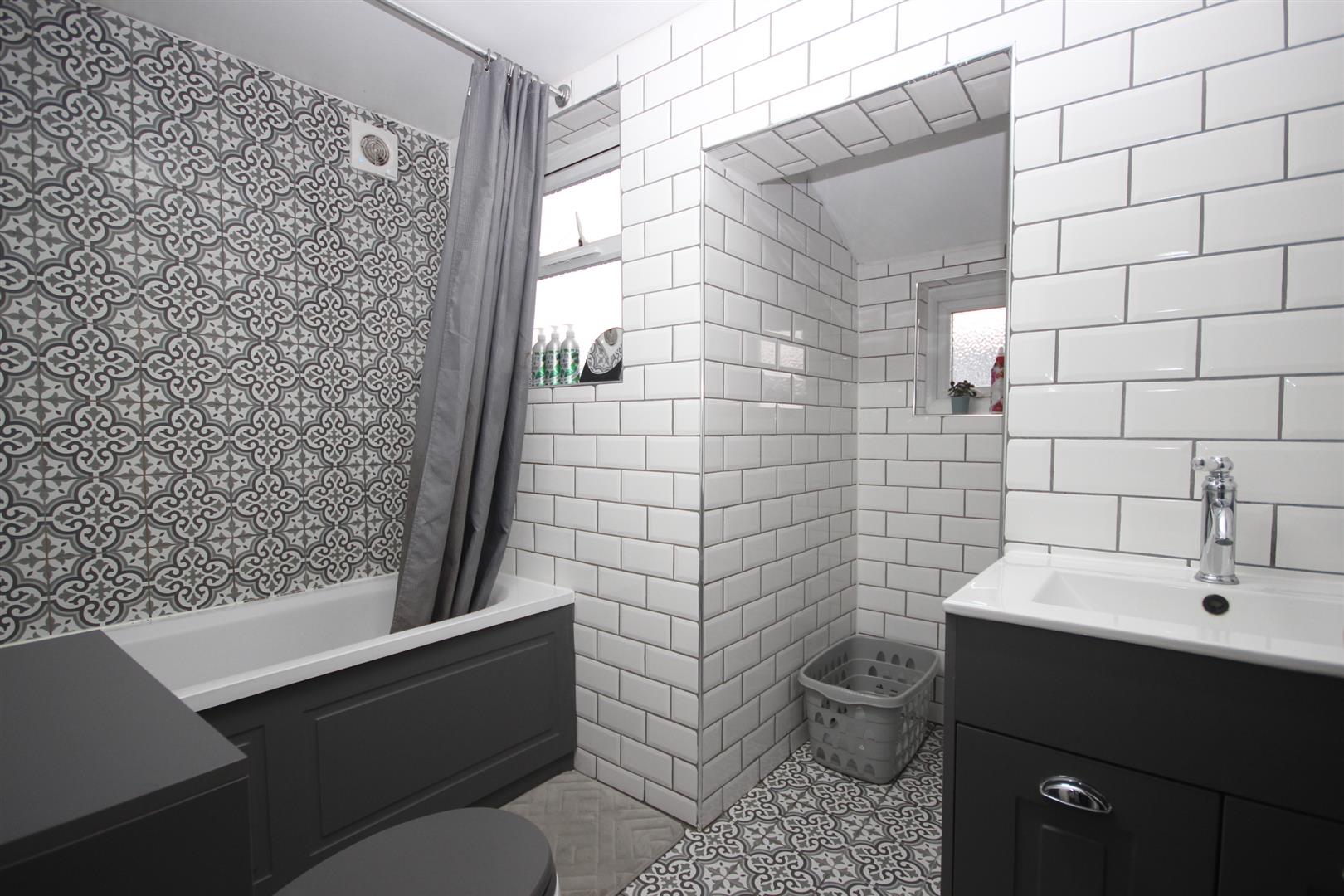 Three piece suite comprising bath with mixer shower over , low level WC, vanity wash hand basin, plumbing for washing machine, 2 double glazed windows to rear.