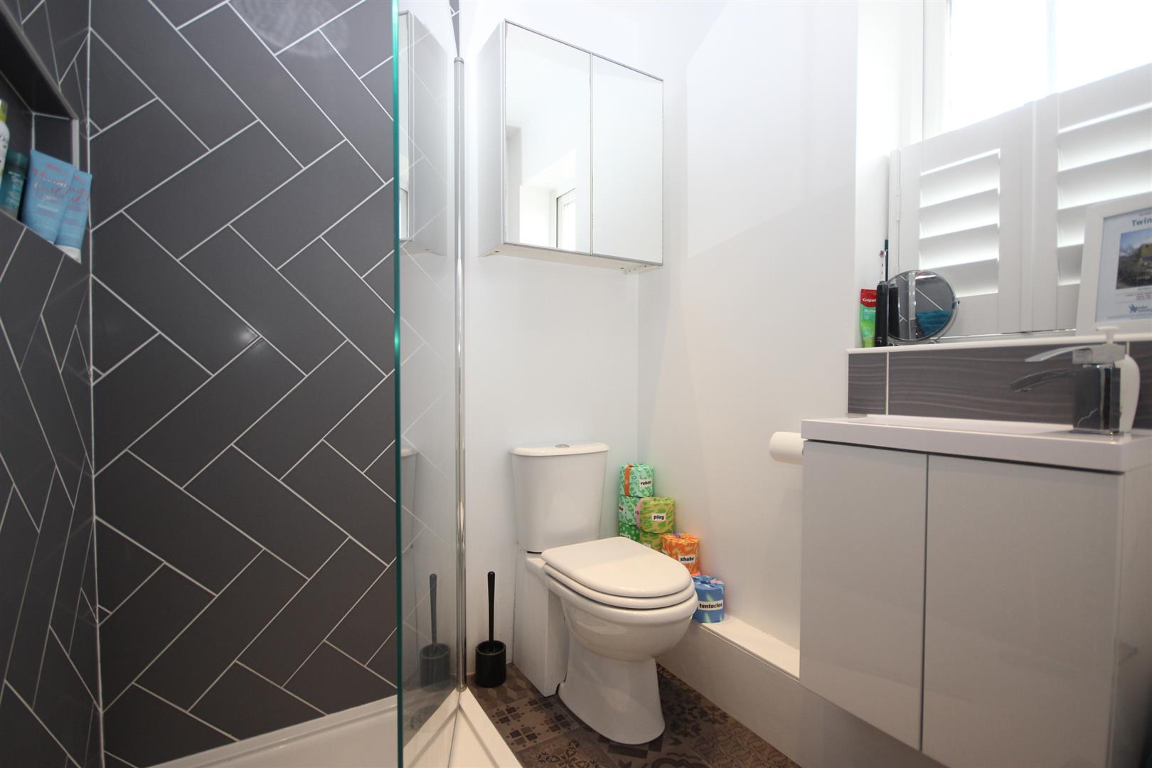 Three piece suite comprising shower, low level WC, vanity wash hand basin, inset spotlighting, double glazed window to front.