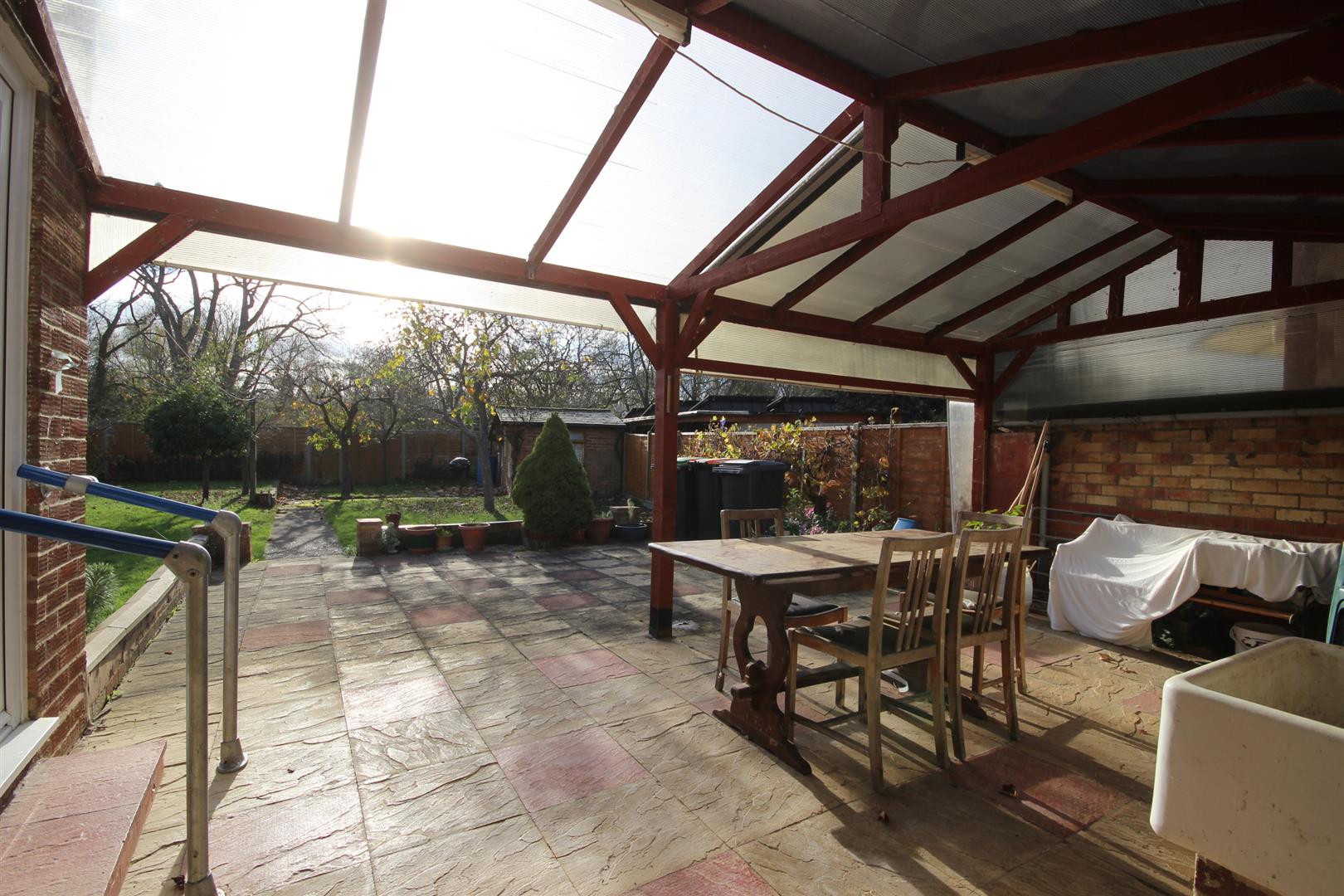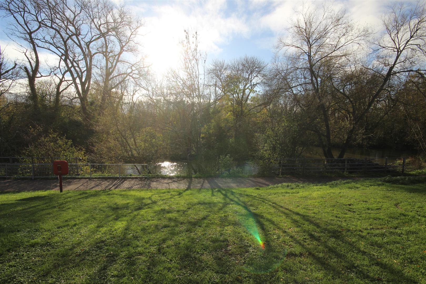Larger than average, patio area with covered canopy with butler sink, water tap, and passage way leading to front access , laid to lawn with flower and shrub borders, various fruit trees, wood panel fence surround, gated rear access leading to river.