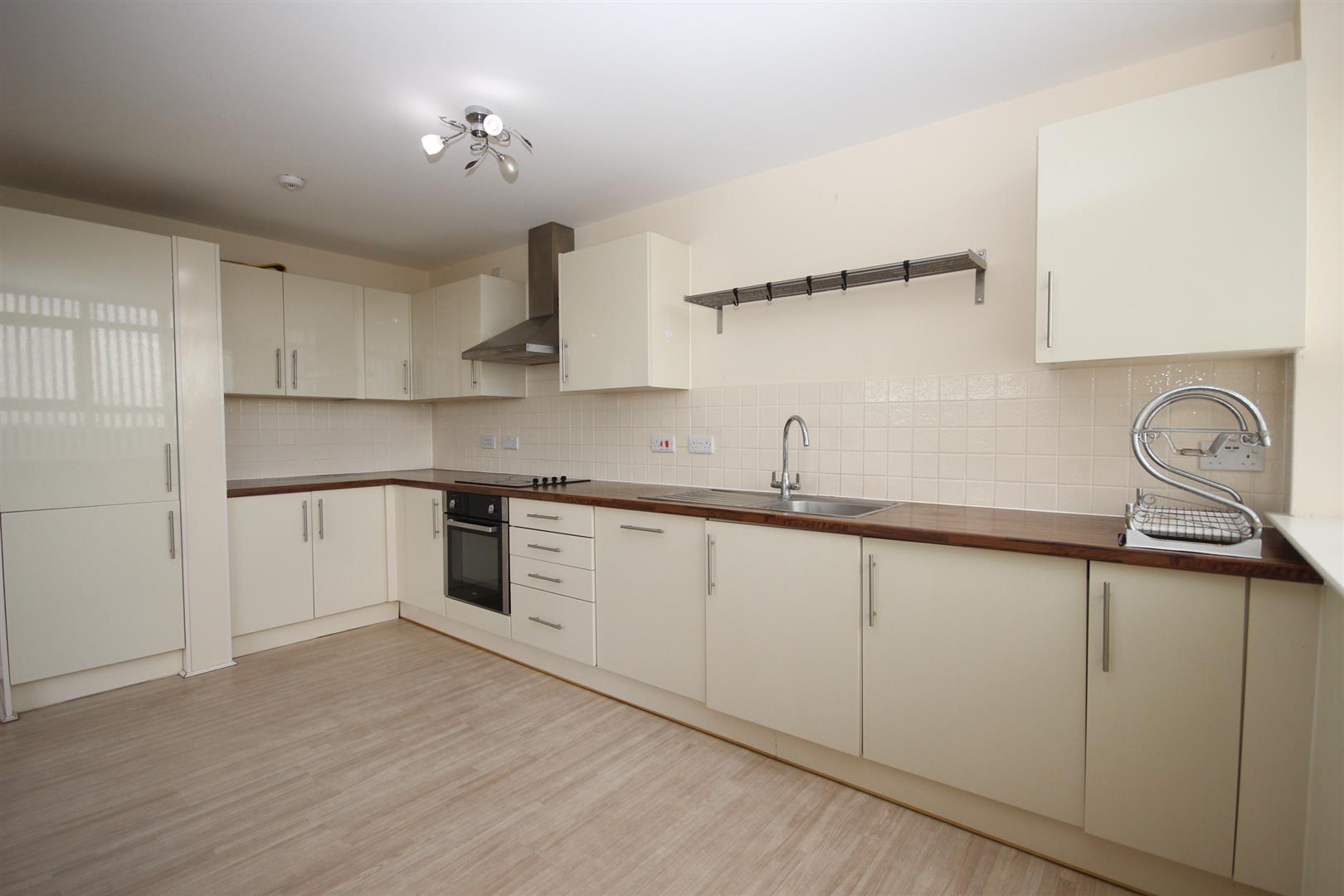 Built in four ring electric hob with oven under and extractor over, base and wall mounted units, integrated dish washer and fridge freezer and washing machine, wall mounted heater, double glazed windows to side, double glazed sliding patio doors leading to balcony.