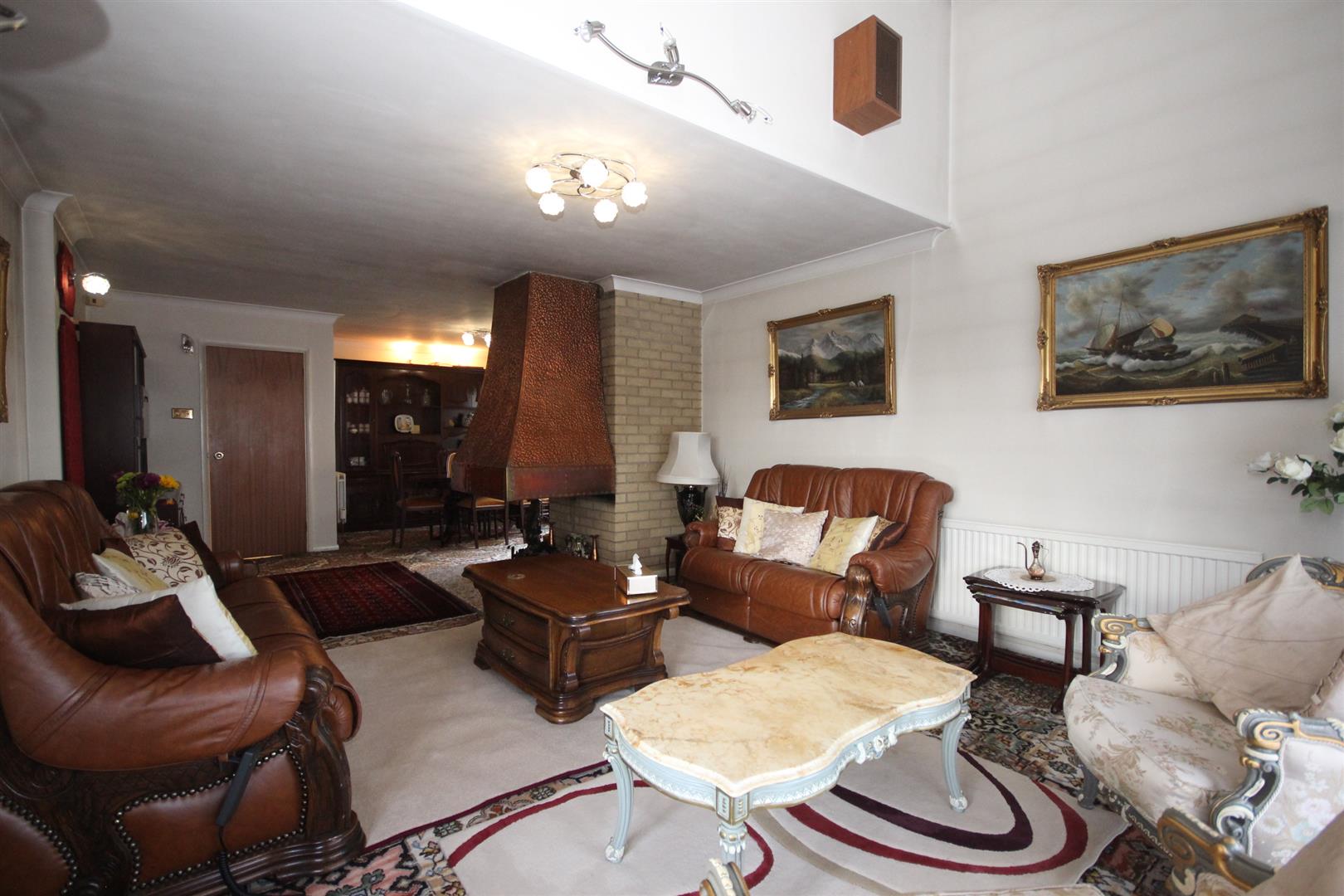 Patio doors to front aspect, double glazed window to side, vaulted ceiling, coal effect gas fire with tiled hearth and canopy over, double glazed window to side.