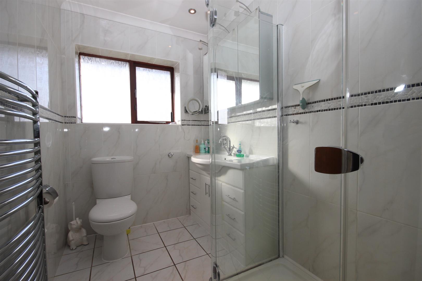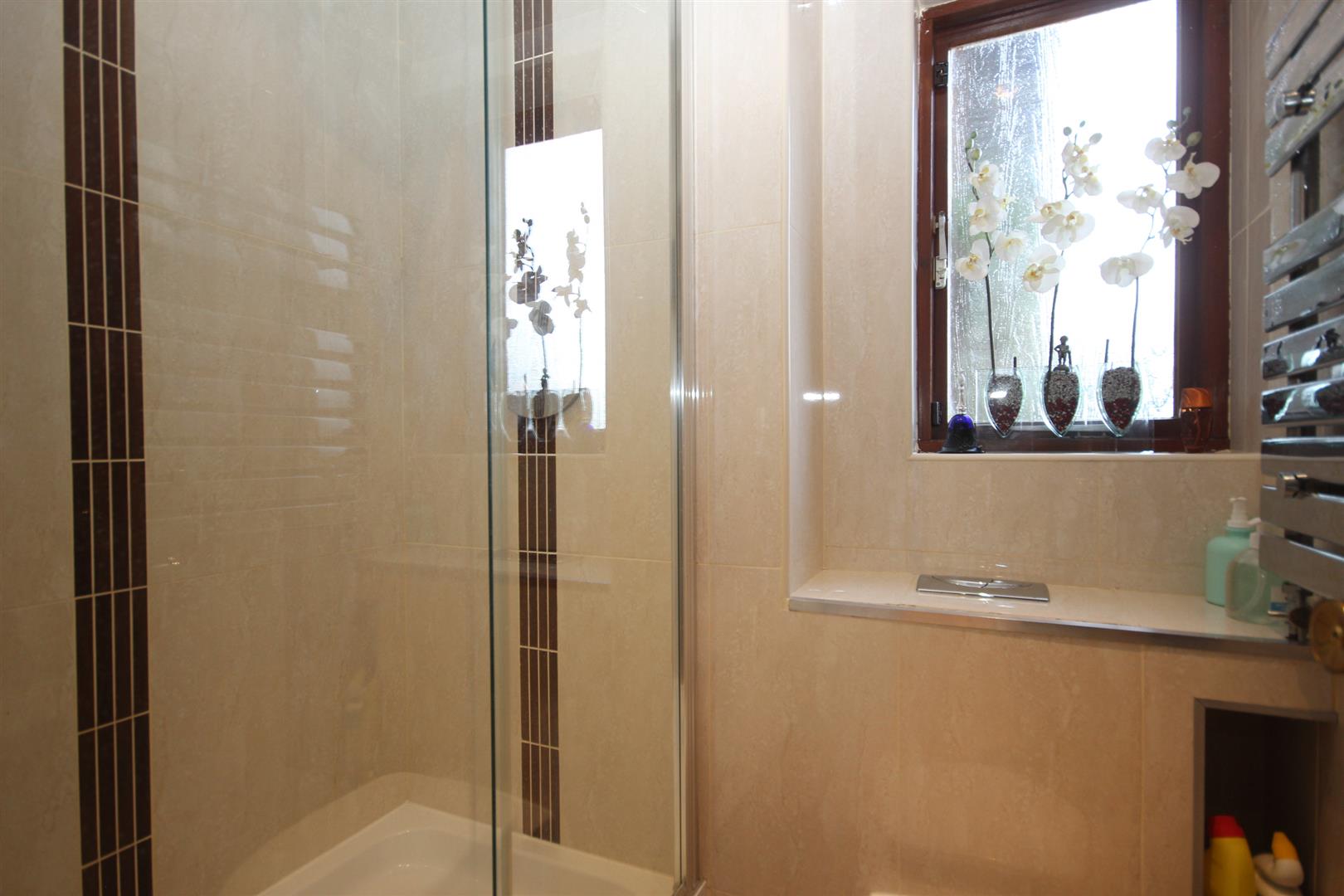 Three piece suite comprising, shower, vanity wash hand basin, low level wc, heated towel rail, double glazed window to rear.
