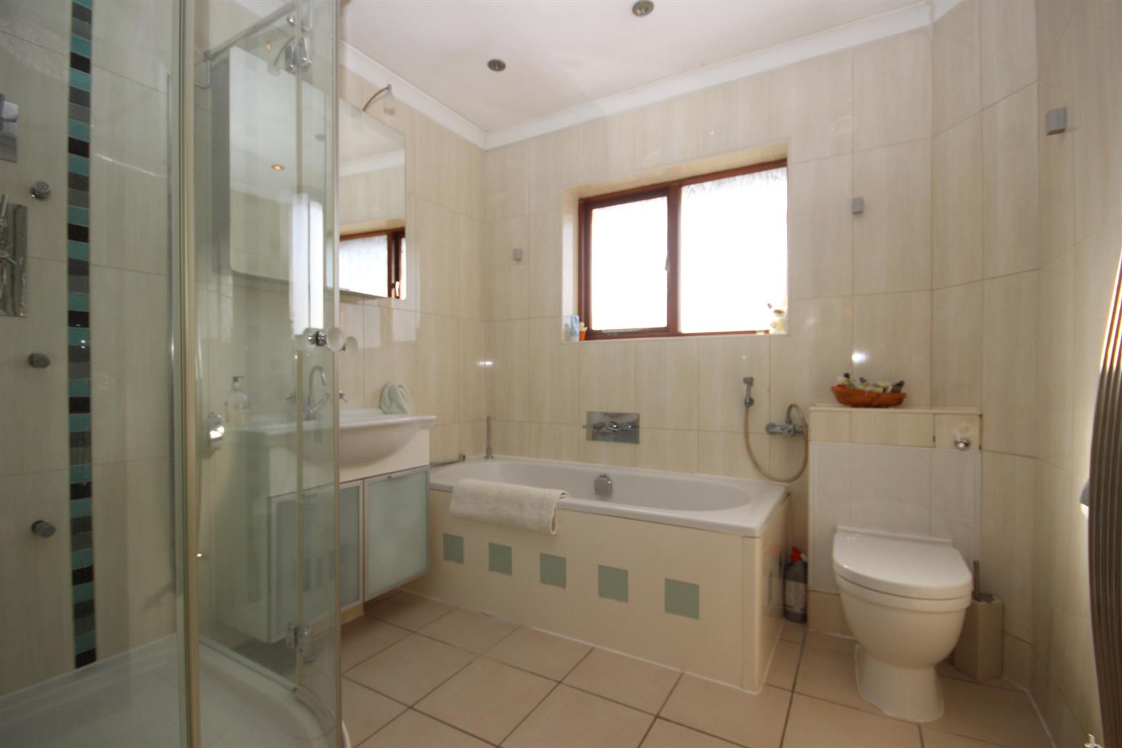 Four piece suite comprising shower, bath, vanity wash hand basin, low level wc, heated towel rail, inset spot lighting, double glazed window to rear.