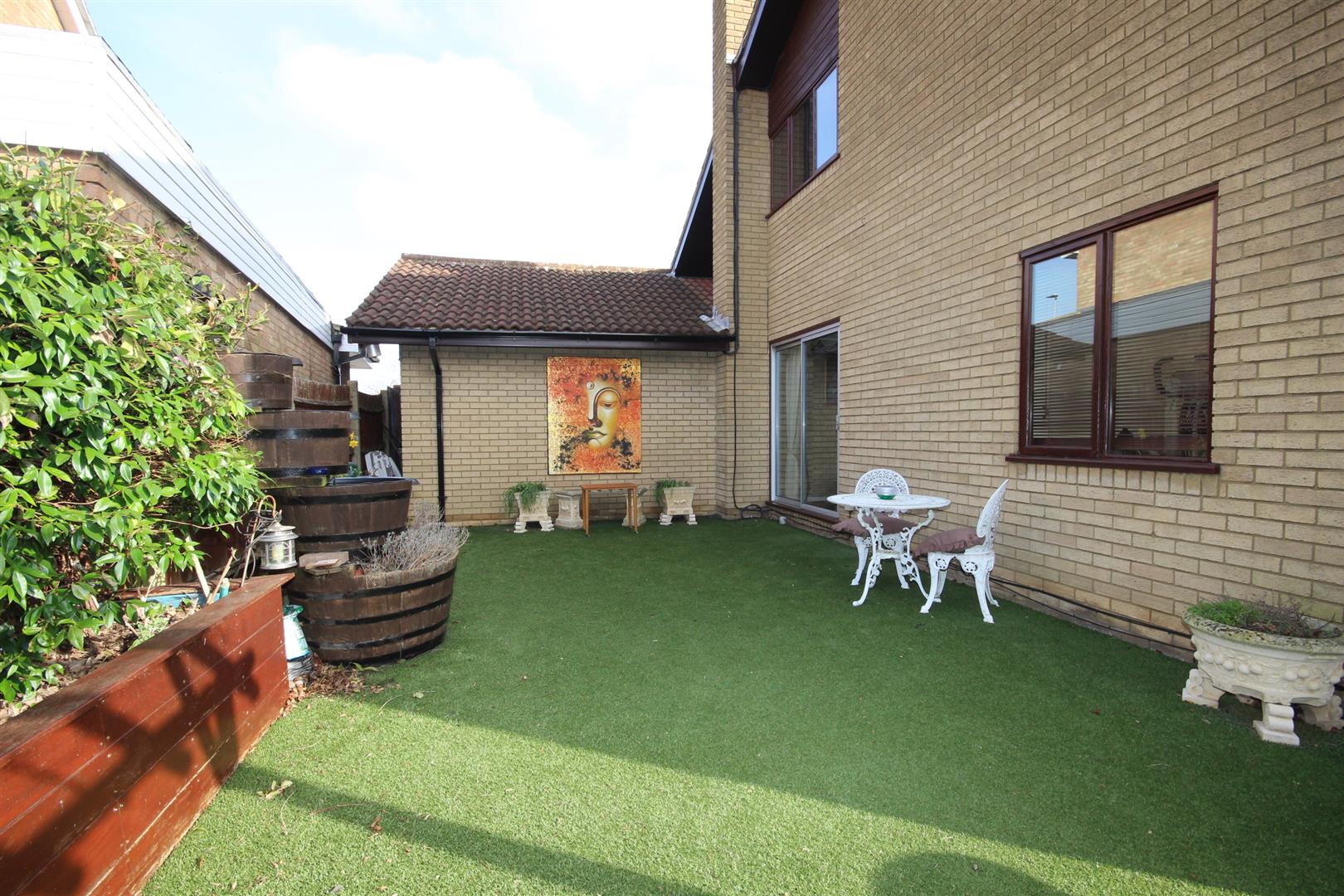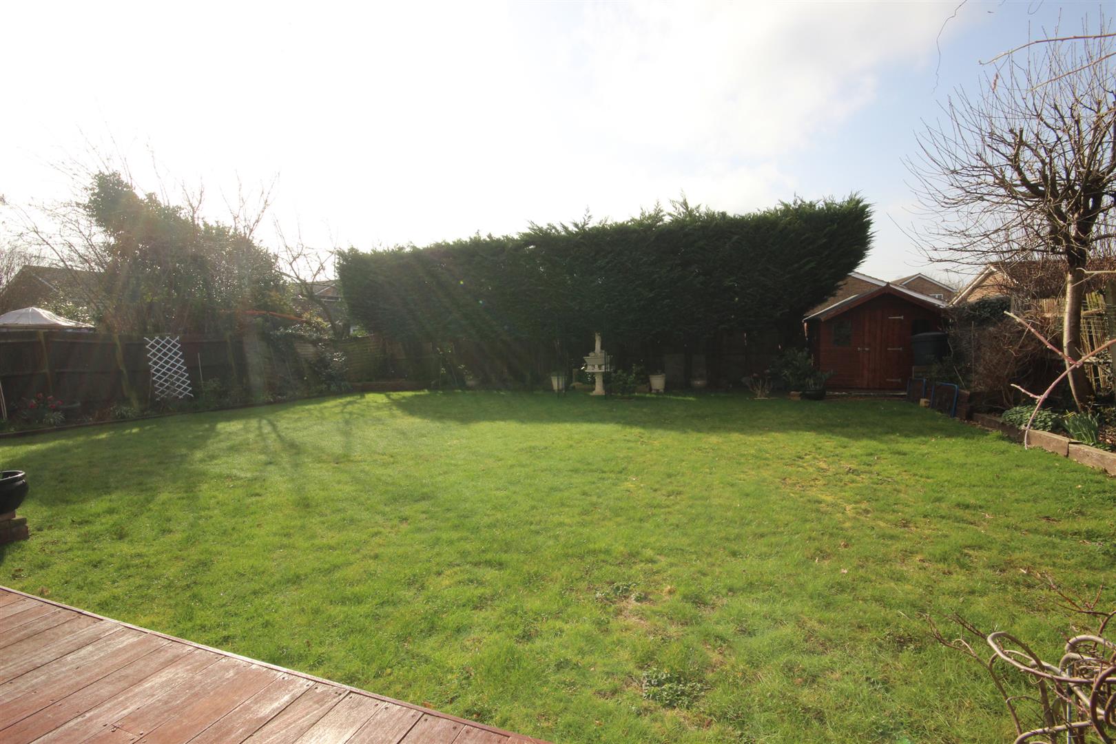 Laid to lawn, mature trees to rear, wood panel fence surround, flower and shrub borders, patio area, water tap, wood decking with pergola , part artificial grass, garden shed, outside lighting, concealed air source heat pump, gated side access.
